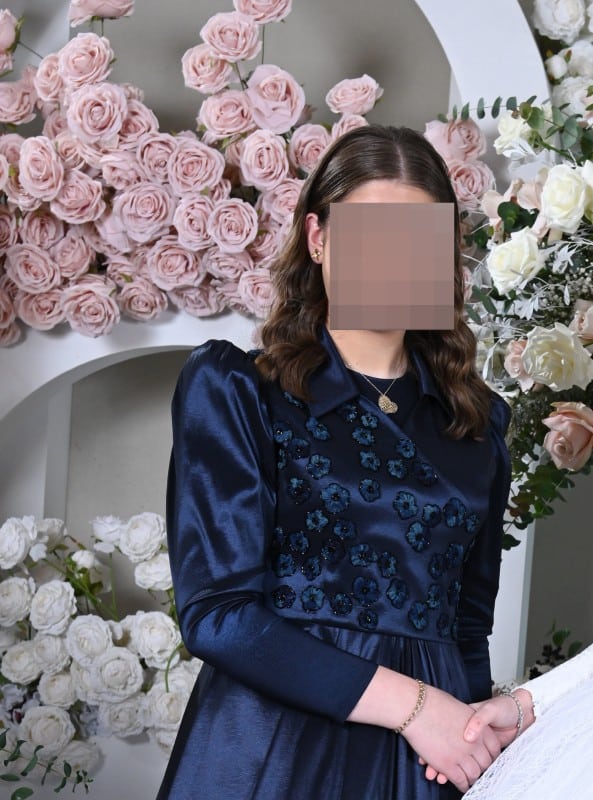 Beautiful, slenderizing, custom designed, blue gown for sale