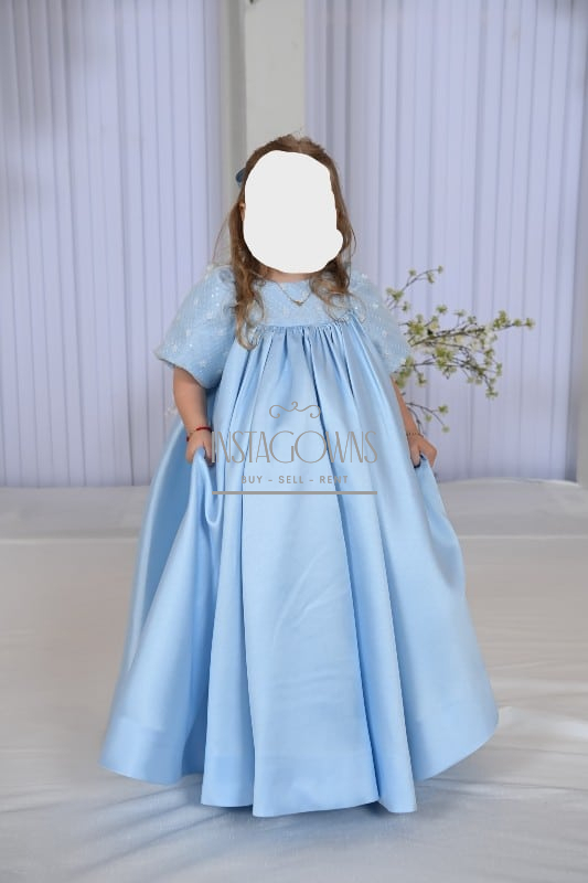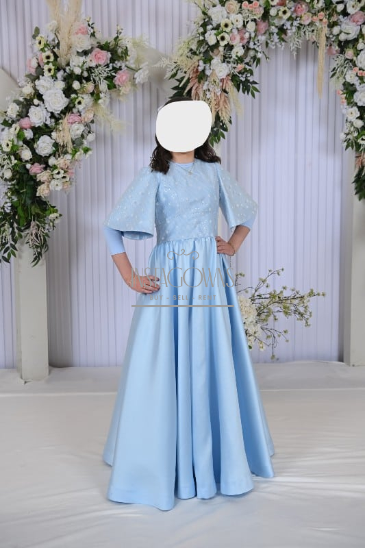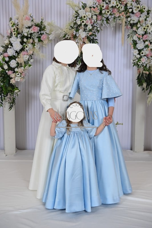 To rent: 1 custom-sewn, off-white, two-piece, size 0-2 for older teen or young married, and 2 custom-sewn, light-blue gowns sized for a 3-5 year old and for 11-13 year old.