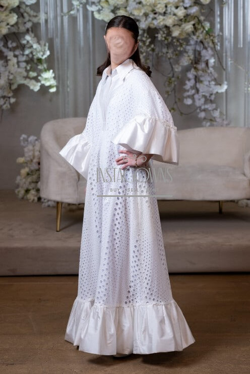 Designer Eyelet Gown with Satin sleeve and tear for sale can also be used for Maternity for sale
