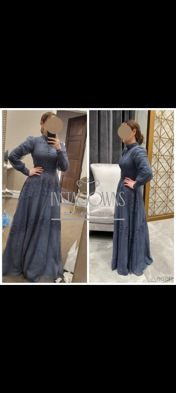 Elegant blue-grey semi custom Silhouette gown for sale