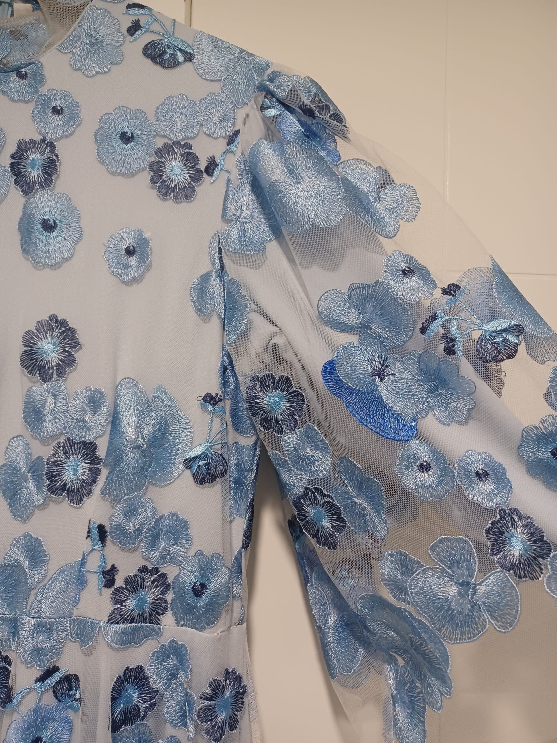 Exquisite light-blue gown featuring intricate embroidered floral designs. Crafted from soft, flowy fabric with a universally flattering cut, this dress creates a truly stunning appearance. Price negotiable.
