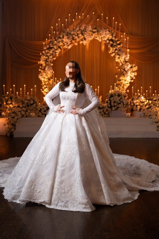 Stunning custom gown with intricate lace perfection! Dramatic train, flowing long veil, fitted corset, and a show-stopping puffed skirt . A true masterpiece!