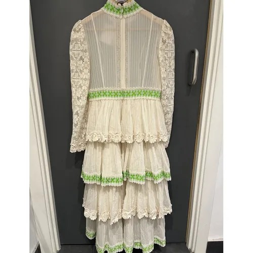 A gorgeous brand new with tags silk cotton Georgette midi dress featuring a stand collar, tiered skirt, pintucks and embroidered lace trims throughout.