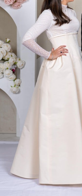 Stunning Custom Designer Gown with Shimmer Bodice Top & Wide Waist Ivory Satin Bottom