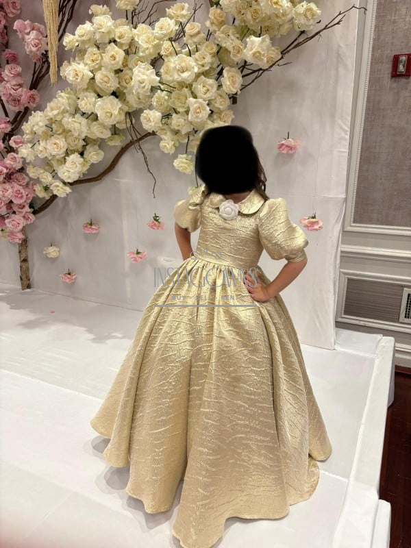 Little Girls High waisted Gold Gown with Peter Pan collar and Chanel like flower and puffed sleeves with tulle detailed back